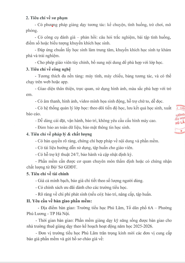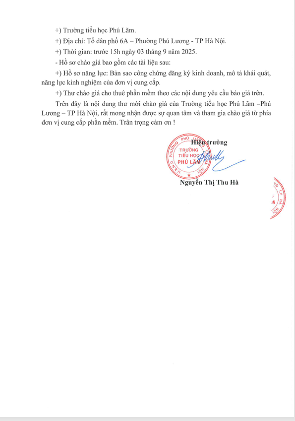 THƯ MỜI CHÀO GIÁ CHO THUÊ PHẦN MỀM DẠY KNS PHỤUC VỤ HOẠT ĐỘNG DẠY HỌC TẠI TRƯỜNG TH PHÚ LÃM - PHÚ LƯƠNG - TP HÀ NỘI